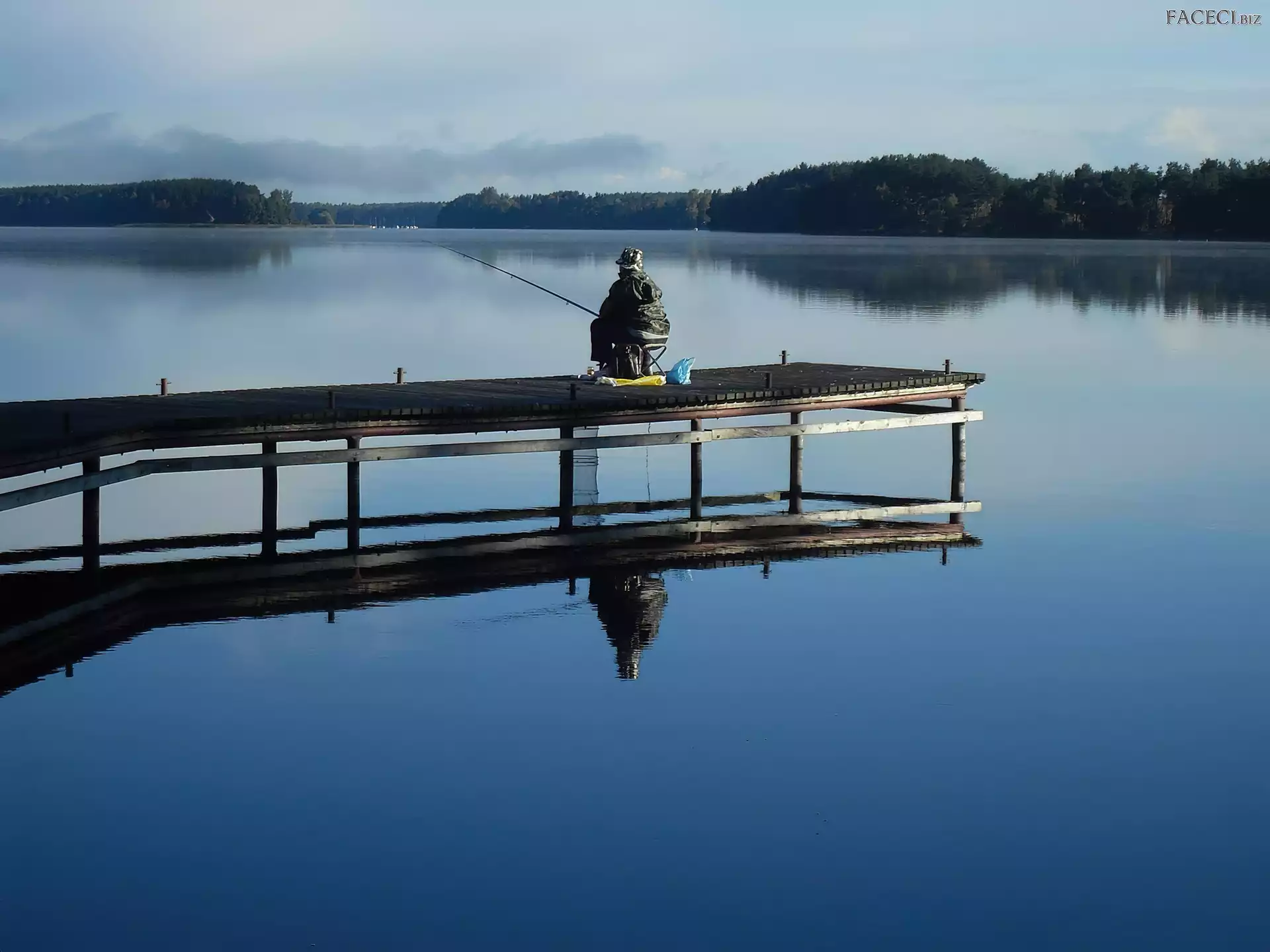Las, Mgła, Jezioro, Wędkarz, Pomost - faceci.biz